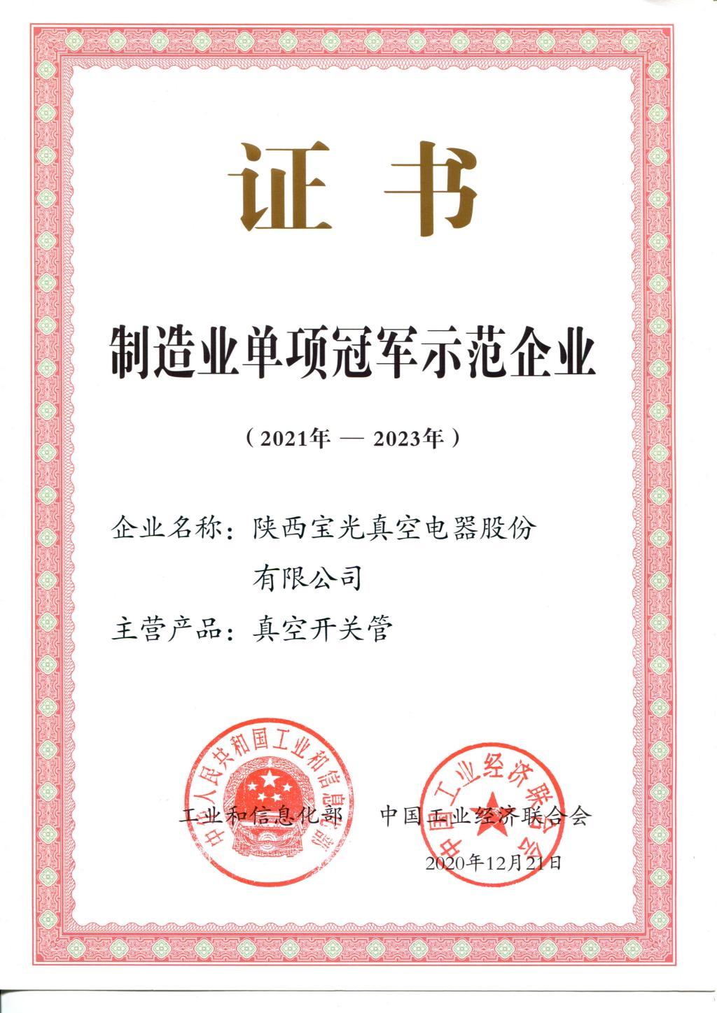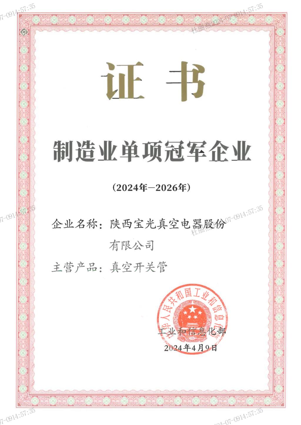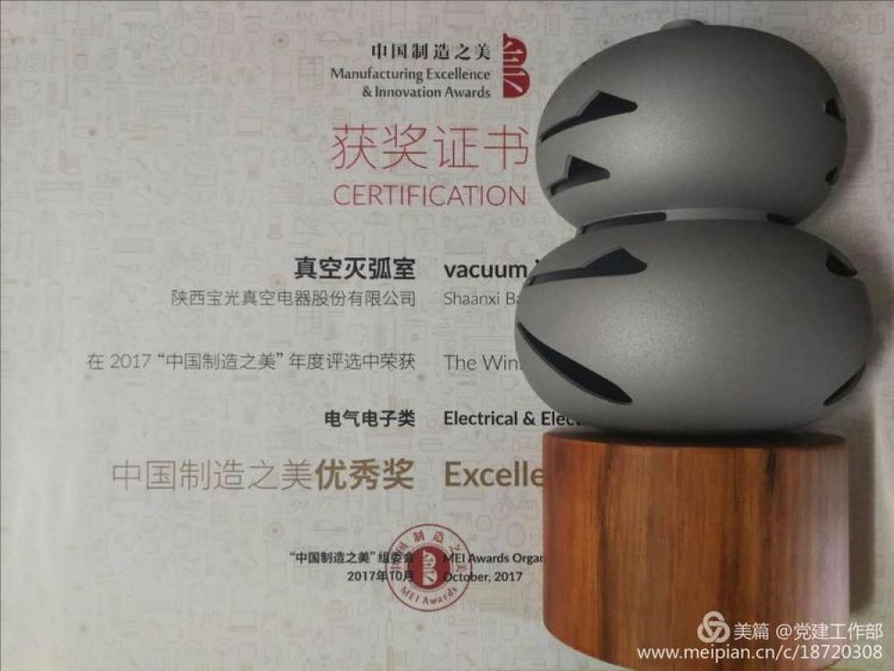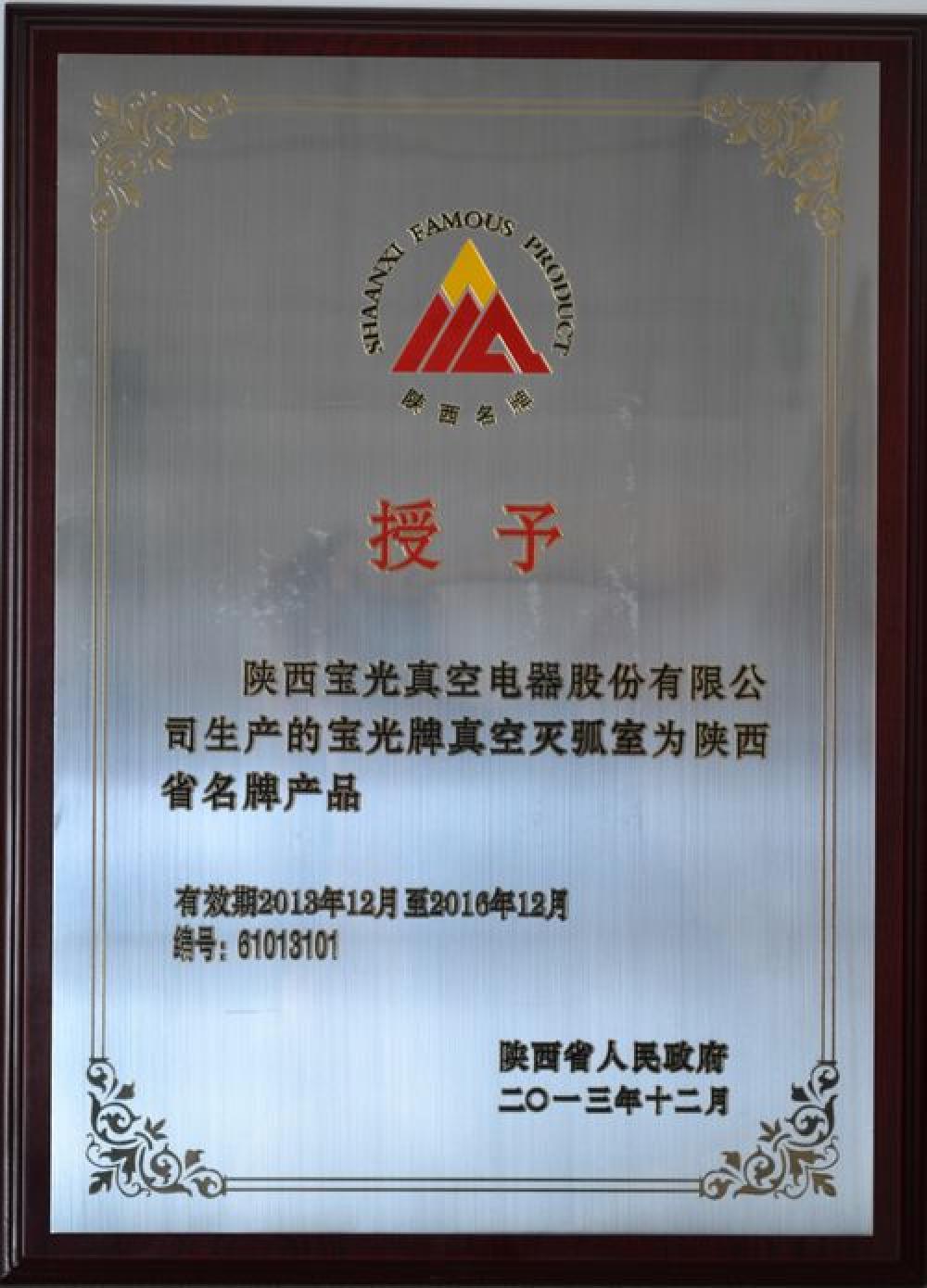 寶光牌真空滅弧室被授予陜西省名牌產品稱號