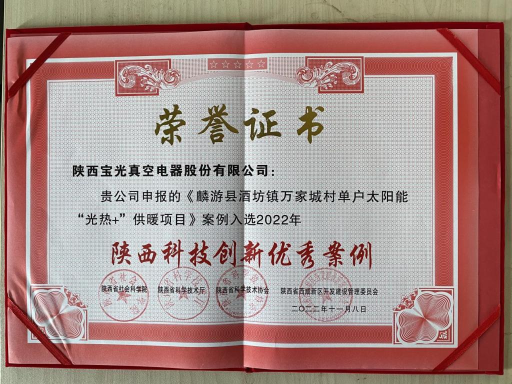 近日,陜西省社會科學(xué)院、陜西省科學(xué)技術(shù)廳、陜西省科學(xué)技術(shù)協(xié)會、陜西省西咸新區(qū)開發(fā)建設(shè)管理委員會聯(lián)合發(fā)布“2022年陜西科技創(chuàng)新優(yōu)秀案例”,寶光股份申報的《麟游縣酒坊鎮(zhèn)萬家城村單戶太陽能“光熱+”供暖項目》成功獲選高效治理高品質(zhì)生活組“陜西科技創(chuàng)新優(yōu)秀案例”。