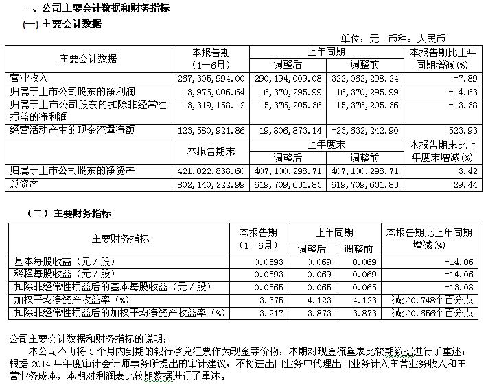 寶光股份2015年半年度主要財務指標